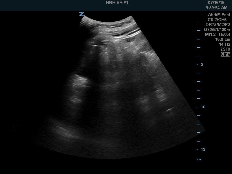 After examining her I started by scanning for free fluid. Here is the RUQ: